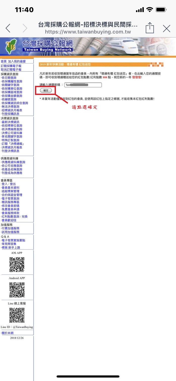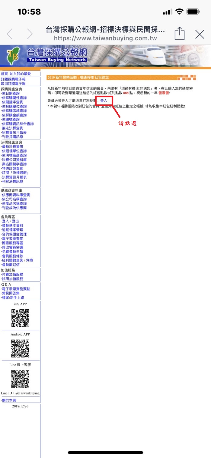 ***如果您已收到實體紅包信函,請依指示操作即可收到紅包點數,無須操作以下步驟*** 即日起拿起您的手機掃描台灣採購公報網首頁左下方的QR Code碼,加入台灣採購公報網線上LINE客服為好友(※若您已有加入過請直接至步驟3操作),並依照以下的操作方式完成步驟後,將贈送您好運紅包紅利點數888點,一個帳號限領取一次,心動不如馬上行動,立即拿起您的手機參加活動,也祝您新的一年好運發發發!! |
